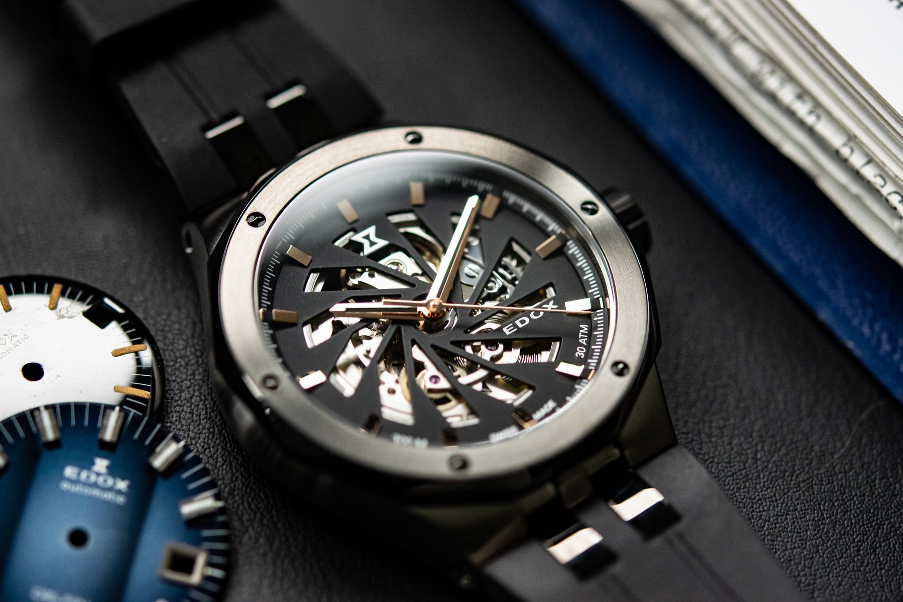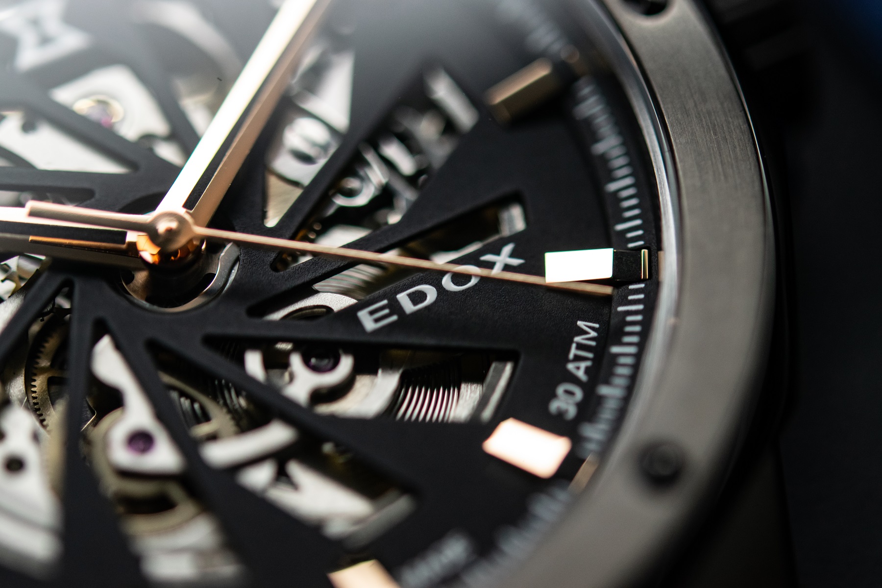 Edox crown and/or pusher with double O'ring , Luminescent hands and/or indices , Screw-down crown and/or pushers , See through caseback