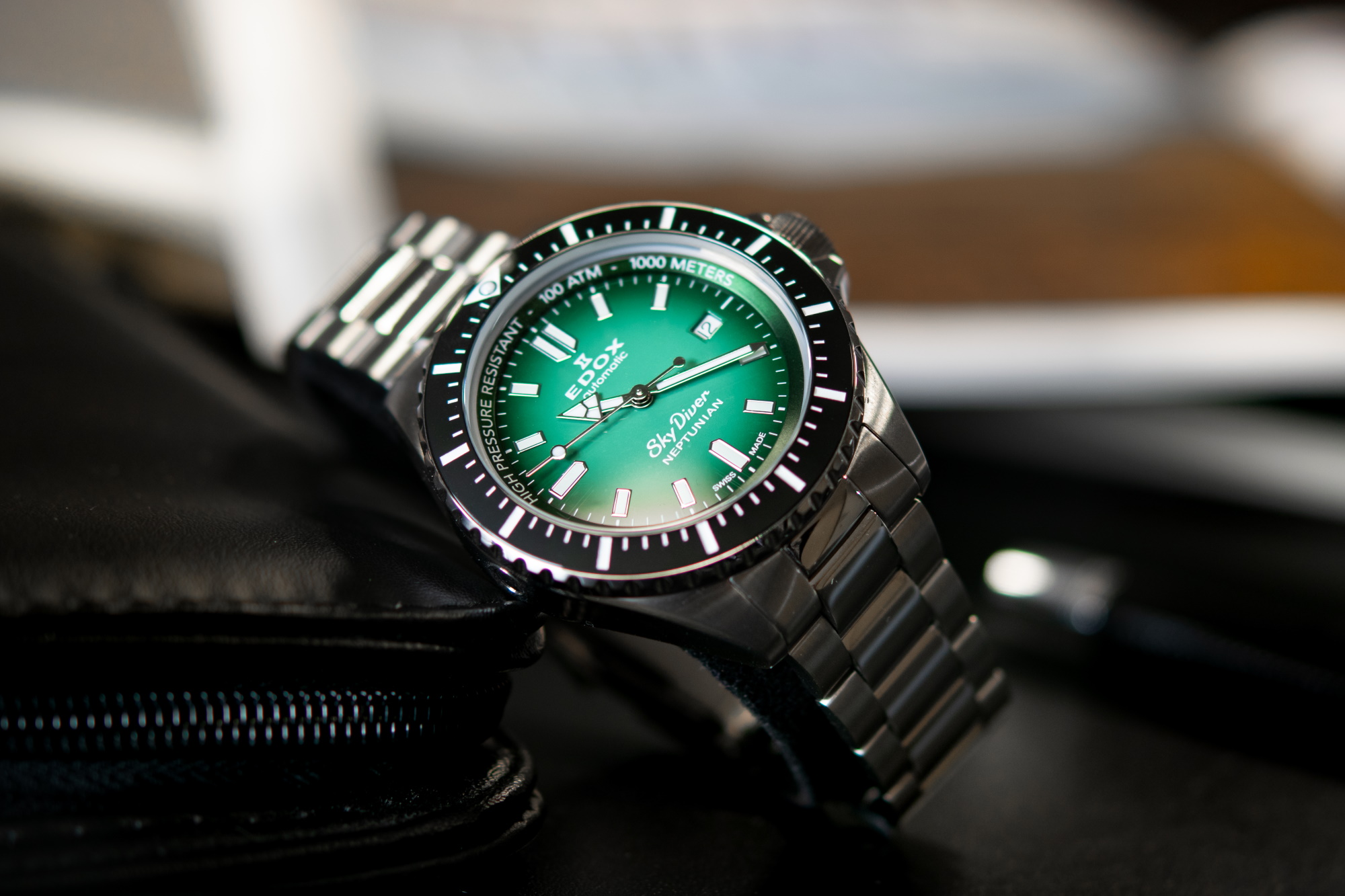 Edox crown and/or pusher with double O'ring , Helium valve , Luminescent hands and/or indices , Rotating ceramic bezel , Screw-down crown and/or pushers